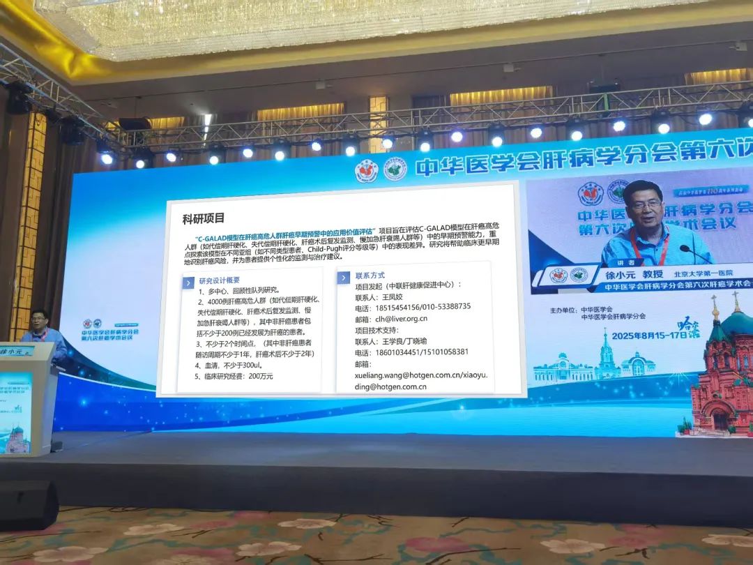 • “揭榜挂帅”助力肝癌早筛研究:为加速肝癌早期预警技术的临床转化与精准应用,徐小元教授在会上重磅发布“C-GALAD模型预警肝癌风险”揭榜挂帅科研项目。该项目投入200万元科研经费,面向全国招募具备肝癌高危队列资源的医院或研究机构,合作开展多中心、大样本量(4000例)的回顾性研究。研究旨在深入评估C-GALAD模型(整合AFP、AFP-L3%、DCP及年龄、性别)在不同类型肝癌高危人群(如肝硬化、肝癌术后、肝衰竭等)中的早期预警效能及其亚组表现差异,研究将帮助临床更早期地识别肝癌风险,并为患者提供个性化的监测与治疗建议。