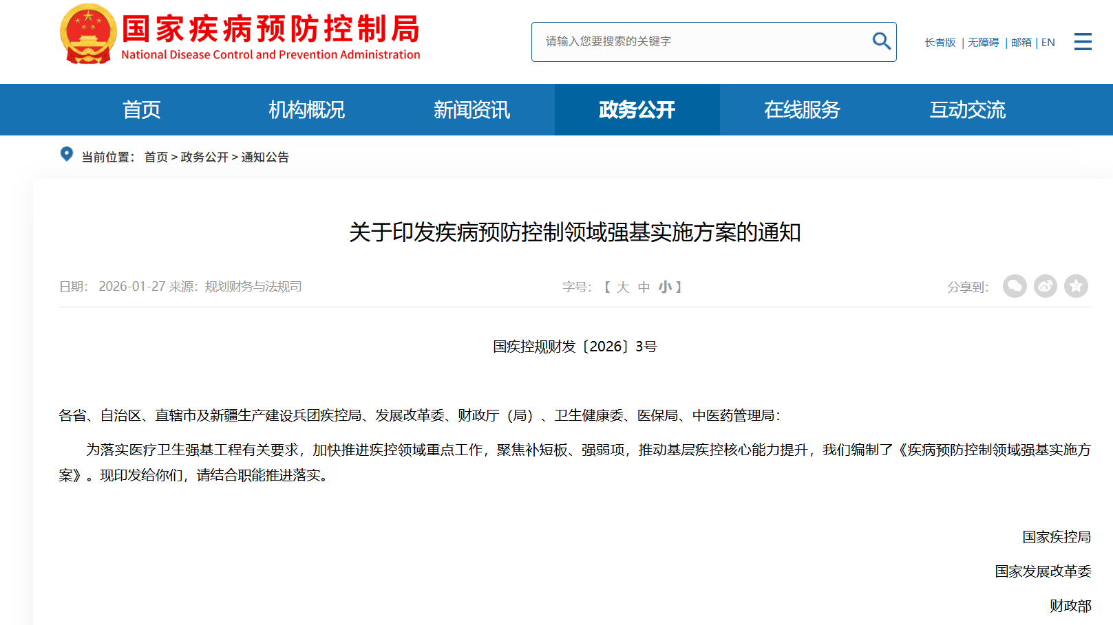 近日,国家疾控局、国家发展改革委、财政部、国家卫生健康委、国家医保局及国家中医药局联合发布了《疾病预防控制领域强基实施方案》(以下简称“方案”),为基层疾控体系的现代化建设指明了方向。